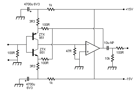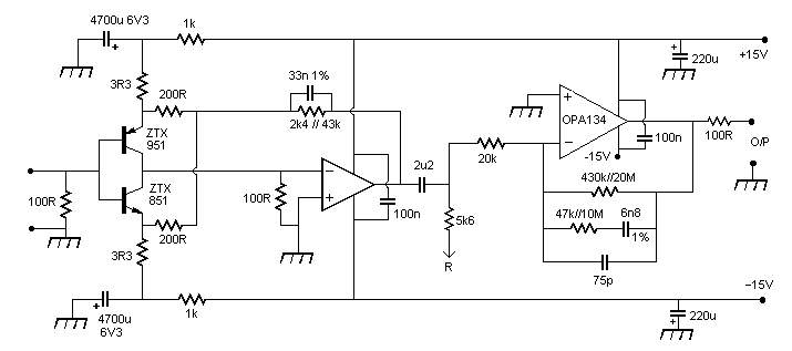 Using what is in effect two input stages in parallel has its dangers, particularly with two separate feedback networks. Failure to accurately match the two networks can have unwanted effects if we are not careful, and in practice matching is quite difficult because each network includes a high value electrolytic, and their capacitances and their series resistances are not close tolerance. The immediate connection of the input stage collectors avoids any modulation of operating current levels of following stages with unbalanced feedbacks. This point at the collectors is a 'virtual earth' because of the op-amp feedback via the input transistors, and there should be very low signal level at this point. The op-amp can be almost any type with unity gain stability, and at least moderately low noise. The OPA134 or for both channels the dual version OPA2134 would be my own choice. The ZTX951 and ZTX851 are chosen for low noise with low source impedance, primarily a result of low base-spreading resistance rbb', reputedly under 2R. There is an additional equivalent noise resistance in series with the emitter of about 0.5/gm, so high gm and therefore high emitter current are needed, around 10mA. The feedback resistors shown as 3R3 also add noise, so their value needs to be small. The two transistors are effectively in parallel, and this can reduce the noise by about 3dB compared to a single transistor stage.