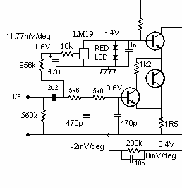 The available peak output voltage is reduced slightly by the temperature coefficient of the output stage DC operating level, but in practice the effect may be too small to be worth worrying about. My own amplifier runs only slightly warm with a 60V supply, and the drift in operating point between cold and normal operating temperature gives less than a 1V variation from the optimum level for symmetric clipping. This would reduce maximum unclipped sine wave power by only 0.4dB. I am reluctant to add temperature compensation partly because I want to keep the design simple. My favourite solution is shown next, using the LM19 temperature detector (1V6 at 25 deg.C, -11mV/deg.C, 3 pin TO-92). In practice, unless a stabilised supply is used the positive supply voltage is variable, and so even a perfectly constant 'mid-point' voltage will not ensure accurate symmetrical clipping, so it is a questionable improvement.
