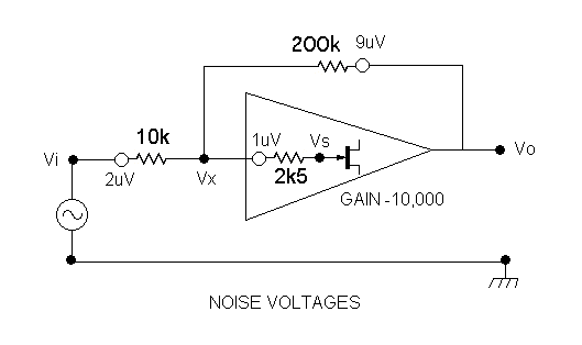 The important point is that for a high open-loop amplifier gain, shown here as -10,000, Vs is very small. If we cheat a little by looking further down the page we find the value of output voltage Vo is 46 uV, so Vs must be that value divided by the voltage gain, so it is only 4.6 nV. This is insignificant compared to the 1uV noise voltage, so Vx must be almost exactly 1 uV. The 'almost exactly' is important, if it was exactly 1uV then the noise voltage of the 10k input resistor would have no effect on Vx and therefore no effect on the output Vo. The effect is however found as a contribution to the 'insignificant' Vs.To work out the total output noise voltage Vo we need to calculate the contribution from the three noise generators individually, in each case setting the other two to zero.