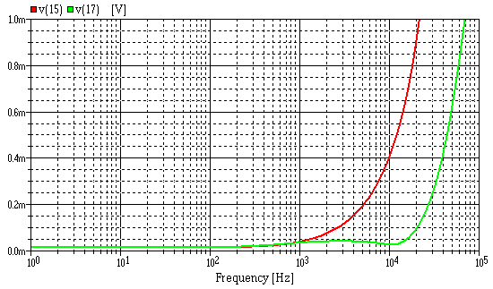 I tried a few simulations to see what frequency range the nulling was effective at, and to determine how to add trimming for high frequencies. The next plot is probably unrealistic, it shows the distortion level based on a linear approximation in which 1% open-loop distortion is added to the output stage. The red trace is without feedforward, and the 1.0m level is equivalent to 0.001% distortion. The distortion level at 10kHz is the level of an output distortion component at that frequency, not the distortion of a 10kHz input, so the upper limit agrees with my original specification that 'distortion components up to 20kHz are under 0.001%'. Adding the feedforward the distortion components are in green, and only rise to 0.0001% at 20kHz. This is almost certainly over optimistic, one reason being that input and driver stage distortion are ignored. What it does clearly show is how well the feedforward works to reduce output stage distortion at higher audio frequencies where feedback alone is becoming increasingly ineffective. The trimming components added for best results are included in the final circuit, and are 22n plus 100R connected across the feedforward resistor.