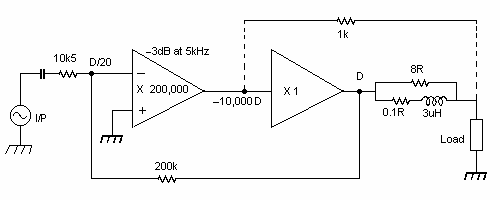 Note that with a 1V output signal level, D will be around 2uV, and 10,000D is then about 20mV. This 20mV is the 'pre-distortion' necessary such that the distortion then added by the output stage straightens it out enough to leave just the 2uV closed loop output distortion together with the 1V undistorted signal.