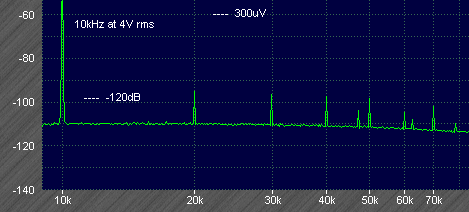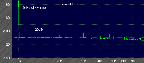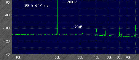 Next at 20kHz the 2nd harmonic is at -123dB and 3rd at -120dB. The 4th is higher at -116dB, as expected the feedforward is becoming less effective at such high frequencies. Lower level components unrelated to the test signal were picked up from the nearby computer or other sources of interference.