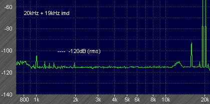 Next, the 1kHz intermodulation produced by 19kHz plus 20kHz is -123dB. This is for a peak to peak test signal output of 11.2V, the same as the 4V rms sinewaves used previously. The rms ratio has been used rather than peak ratio (This is why the -120dB level marked on the picture is at a different level compared to the previous results.) The peak ratio would have been -126dB. There are higher order products at 2kHz and 18kHz around -130dB, plus a 15kHz spike from a nearby tv. The board was not well screened, as can be seen in a photo above, so the various interference components could be much lower when mounted in a case. (The ratio of distortion rms levels to total signal rms voltage has been given here, which I have since learnt is incorrect, the CCIF standard appears to require just one of the test signal components to be used as the reference level, so the 1kHz product should be specified as -120dB.) Later versions of the MJR7 have lower 1kHz components in this test, but the higher order components are worse.