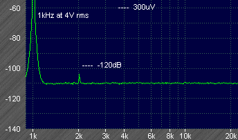 First at 1kHz, only the second harmonic is visible at -126dB (0.00005%). Carefully trimming the feedforward and adjusting the supply wiring to reduce pickup I could get the figure down under -130dB, but I wanted to keep the same settings for all test frequencies. A small adjustable resistance in series with the inductor could possibly provide more accurate nulling here.