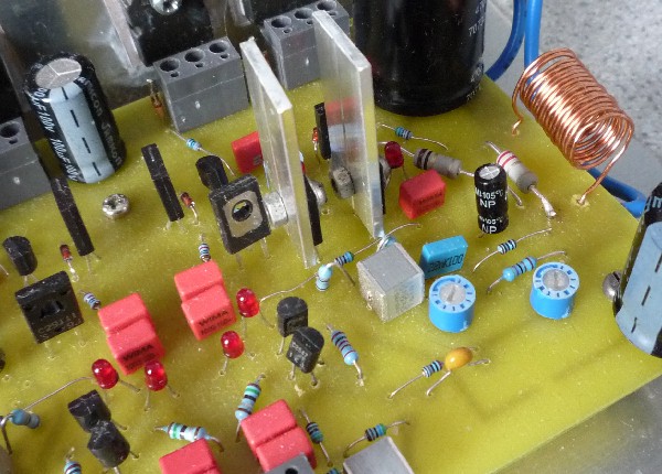 The problem with a low value inductor is that the feedforward buffer stage then needs to operate at a higher quiescent current to ensure it stays in class-A at high outputs. The transistors already run hot, so better heatsinks are needed, but another option is to increase the inductor a little. Using 20swg wire instead of 18swg and using 17 turns instead of 13 the dimensions can be kept unchanged while increasing the value to 0.68uH. I will add these changes to my own final version, but the distortion tests have been completed with the lower value inductor.Here is a photo of the MJR9 board, showing just one channel. It can be seen that there is not much room for the heatsinks, and some redesign of the layout would be needed to make any big improvement. Painting the heatsinks black could help, but probably not enough. This is the most recent version with a 17 turn inductor.
