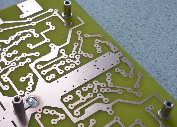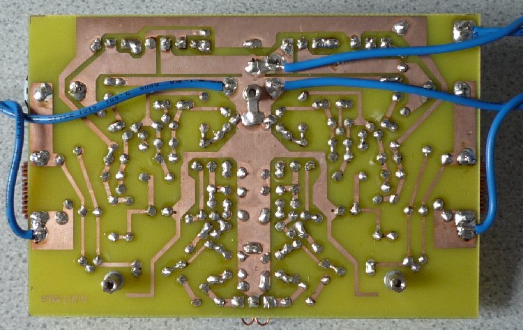 The connections under the board are just two wires to the power supply plus the two pairs of speaker wires. This board was 'tinned' with out of date tinplate solution, which is why it looks more copper coloured. The tinning chemical has a limited shelf life once mixed with water, I need to order some more for the first batch of boards.