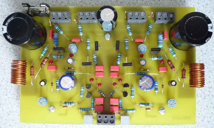The photos are of what was intended to be the final MJR7-Mk5. I forgot that the resistors I had previously planned to use were 0.25W and the ones I ordered are 0.5W. The board was designed for the smaller size resistors, and fitting the larger size the leads had to be bent very close to the resistor body in some cases. The first photo shows the resistors fitted, and it can be seen that there are a few different sizes. Most are the 0.5W types, there are only two 0.25W and also two 0.125W. I have done a few adjustments to the board design, and the 0.5W should now fit easier than in this photo. A few other small adjustments were made, for example the input terminal block is now slightly further forward than in the photo to give more space for the 560k resistors, which still need to be the very small 0.125W types. I have also increased the space round the 63V electrolytics so that larger 100V types could be used. The 4700u should now be ok up to 30mm diameter, and the 470u up to 16mm, but then it may be a good idea to fit the components close to the electrolytics only when the capacitors are in place to be sure there is no obstruction.
