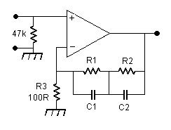 Once we choose the resistor from inverting input to earth as 100R or some other convenient value, then there are no further choices to make, the other 4 component values are also determined and can be calculated. This time I used the alternative network with a resistor in parallel with each capacitor, as shown next: