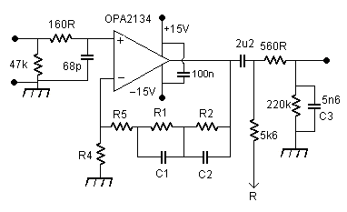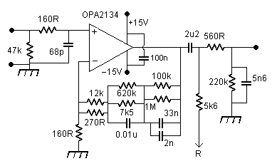The value of R4 also has some effect on the noise level, the noise voltage of this resistor is in effect in series with the input signal, so we want to keep the resistor value small. The OPA2134 noise voltage is about equivalent to the noise of a 3k resistance, so we should aim for something much less to avoid a significant increase in noise. 100R is good, and 424R still ok. I decided to aim for the same 1kHz gain as for my previous circuit, and then we need R4 = 160R and R5 = 264.32 = 270R // 12k, then it is the 160R noise voltage we need to worry about, and this is adequately low.
