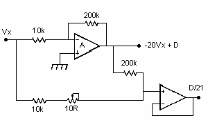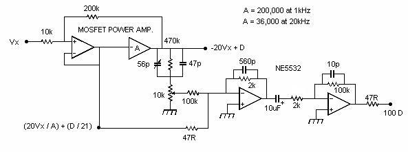 The lack of trimmers in the basic version of this circuit means that there is no way to compensate for the finite gain of the amplifier, and good results will only be obtained if the open-loop gain is very high. Fortunately the gain is over 200,000 at 1kHz, and so the undistorted component at the input is the output voltage -20Vx divided by 200,000. The distortion component D is only reduced by a factor of 21 by the feedback network, so the undistorted component is reduced relative to the distortion by over 10,000, i.e 80dB.