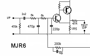 With a high open-loop gain, over 200,000 at 1kHz, and an input stage with a unity gain output available at the input transistor emitter, the MJR6 and MJR7 mosfet amplifiers already includes everything needed to extract the distortion by this method, apart from the trimmers. An approximate equivalent circuit is shown next.