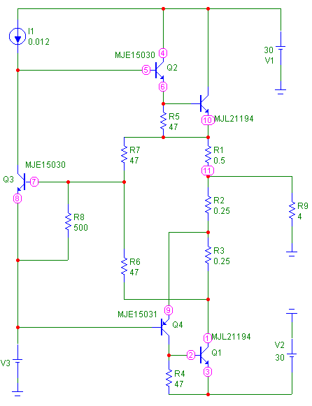 According to the simulation an increase in quiescent current to 600mA will ensure that the error amplifier does not switch off even with the 4ohm load, but of course an efficient heatsink is then needed. An alternative approach is to adjust the values of the two 0.25ohm resistors. Reducing R2, e.g. by about 10%, will increase the negative signal output current from the lower half. If the current is then too high the error amplifier will conduct more and add positive current to compensate. If R2 is reduced R1 should be reduced by the same amount to keep R1 = R2 + R3. Initial experiments suggest that this method does work, and a resistor of 2R7 in parallel with R2 plus another 2R7 in parallel with one of the two 0R25 making up R1 prevented the error amplifier switching off. One unfortunate effect, not present in the unmodified amplifier, is that with moderate clipping a serious latch-up effect was observed. It may be that this is only a problem for this particular design, and with a more conventional input and driver it will be better behaved, so this method may still be possible, but for the present design it is not recommended without further investigation.