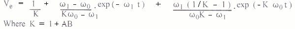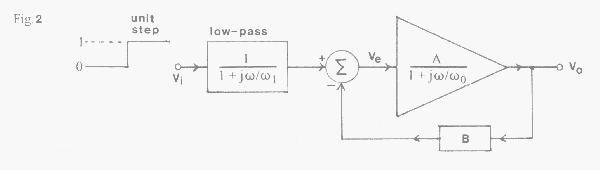 This shows a unit step function applied to a feedback amplifier via a first order low-pass filter with a response -3 dB at w1. The amplifier has open loop gain A at low frequencies, falling at 6dB per octave above w0. The gain of the feedback network is B, and the resulting error voltage at the input stage of the amplifier is Ve. For the unit step input the error voltage is given by the equation: