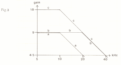 Response b is the commonly recommended 20kHz bandwidth to give zero t.i.d. and the other two responses are both -3dB at 10kHz, which we are often assured will lead to t.i.d. The reason why two such responses are shown can be seen by looking at one final diagram. Fig.4: