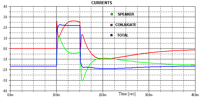 If we connect an amplifier and apply a voltage pulse the currents are as shown next. After the end of the pulse the speaker current (green) has a negative peak over 3A, but the conjugate network current (red) at the same instant is a positive peak about +1.3A. The total current taken from the amplifier (blue) is therefore the sum of the speaker and network currents and is only -1.7A. The shape of the current is about the same as the voltage pulse, so the speaker plus network is almost exactly resistive.