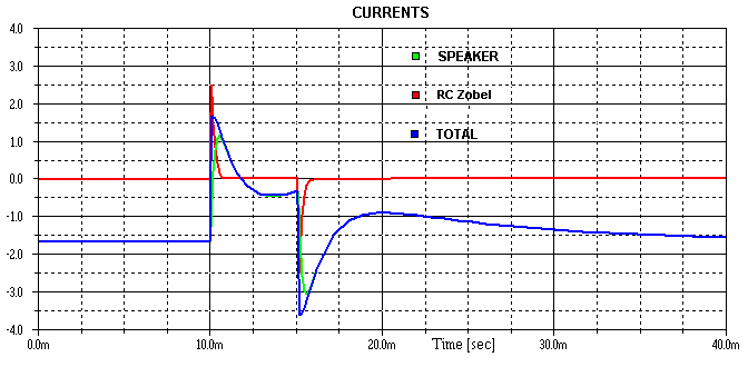 It is quite common to just add a simple RC Zobel across the speaker to prevent just the high frequency impedance rise, and this is far more convenient if we look at the component values needed for the full conjugate network; there is a high value capacitor which needs to be non-polar. If however we leave out the series LCR part and just use the RC Zobel we find the current through the RC is in the same direction as the speaker current after the pulse, and the peak current taken from the amplifier is even higher than the speaker alone, as shown next:
