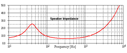 The first plot is the speaker impedance without the network connected, as expected there is a peak at the bass resonance frequency and a rising impedance at high frequencies because of the inductance of the voice coil.