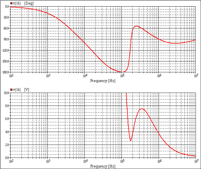 ( The apparent discontinuity in the top phase plot happens because AIM-Spice only plots phase from -180 to +180 degrees, and anything more negative than minus 180 becomes a positive phase, so the sudden jump is of no real significance. A 1V input to the feedback loop was used, so the voltage in the lower plot is equal to the loop gain.)