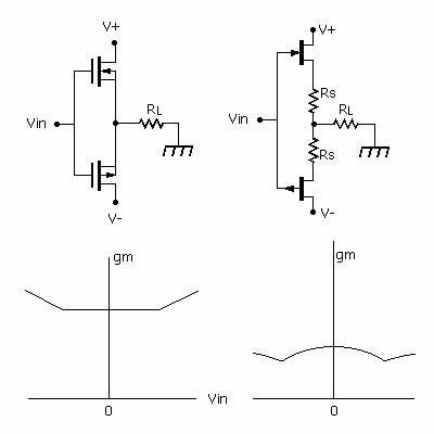 The same circuit can be used with low-power fets as an input stage, which can then have its output taken from either the sources, with the load resistor being omitted, or the drain currents can be subtracted in one way or another, with the 'load resistor' shown now being used to set the gain, or being reduced to zero. Low-noise jfets are available, but the problem when using these in the left-hand diagram is that they have zero Vgs with no signal, and the junctions become forward biased with signals applied, severely limiting the input voltage range unless RL is high enough. It is tempting to add source resistors as shown on the right, but in either an input or output stage this will make the gm graphs curved rather than linear, and the two devices will no longer give a horizontal line, even if they are perfectly matched and also perfectly square-law. This is a good example of how a little local feedback can add distortion, including some high order harmonics. In practice for less than perfect square-law devices high order harmonics will be present in any case. An article, Small-Signal Distortion in Feedback Amplifiers for Audio by James Boyk and Gerald Jay Sussman, (a pdf file), shows the results of numerical methods used to produce intermodulation distortion spectra for feedback amplifiers. They also conclude that the complementary fet output stage can have zero distortion for matched ideal square-law devices.