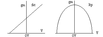 Fets have a fairly accurate square-law response, and a single device will generate almost entirely second harmonic distortion. Using a ltp stage with fets the second harmonic can be cancelled, though accurate cancellation is less easy than for the equivalent bjt stage because of the wider variation in device characteristics. Unfortunately, even if the second harmonic is accurately nulled there will now be a significant level of third and higher harmonics. To see why this happens look at how the mutual conductance of a fet varies with input voltage. The first diagram is for a single fet, the second for a ltp using a pair of fets.