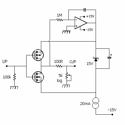 This is just an example, not a tested circuit, and is a line input buffer, with a log volume control to adjust the gain and a servo to reduce output offset by adjusting the supply voltages. The 100R is added to keep the servo working at zero volume setting which would otherwise short the sensed dc offset. Using this sort of volume control rather than taking the output from the control wiper will increase the allowed input voltage range. The mosfets need to have drain current about 10mA with gate voltage 7.5V. One possibility, although not ideal, is the CD4069B digital integrated circuit (cost about 40p). This contains six mosfet complementary pairs, each pair with gates and drains connected as required. Only one pair can be used because if we tried connecting several in parallel the 200mW maximum device dissipation could be exceeded.