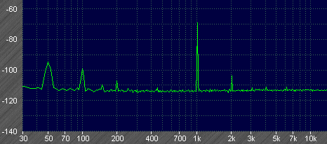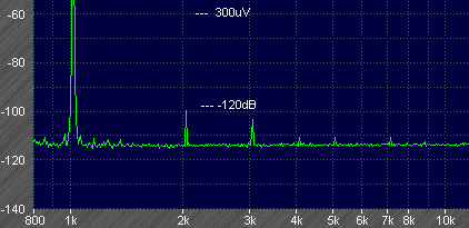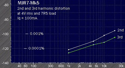 MJR7-Mk1 Distortion: Input 1kHz at 300mV, distortion just appears above the noise level. Second harmonic measured at -116dB (0.00016%). Third harmonic at -129dB (0.000035%).![]()