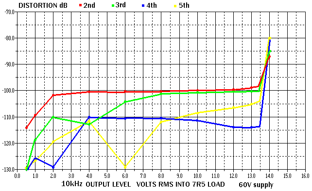 The 4V signal level used for most of the distortion tests is chosen to reveal crossover distortion. At much lower levels the output stage can remain in class-A and so have no significant crossover effects, and at much higher levels the crossover region is a relatively small proportion of the output and here also crossover effects may have less effect. Lateral mosfets don't have the fall in gain common to bipolar transistors at high output current, and have far less increase in nonlinear capacitance than vertical mosfets near to clipping, so a great increase in distortion at higher output is not expected. I checked the 2nd, 3rd, 4th and 5th harmonic levels as a function of output voltage into a 7R5 load at 10kHz, and these are plotted next. The only surprise is that the 2nd harmonic percentage stays almost constant as output is increased from 4V up to 13V.