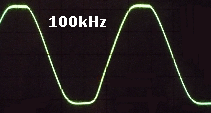 Here is the result of clipping at 1kHz, and to check for problems at higher frequencies the second image is at 100kHz, where nothing serious is found. The peak to peak outputs are about the same, 44V, at both frequencies, demonstrating that slew rate is more than adequate, at least 10 times greater than the peak level I found was needed for music on CD. My signal generator only goes up to 100kHz but there is really no point testing any higher. Since this test the compensation capacitor has been reduced from 220pF to 100pF so the maximum slew rate should be even higher.