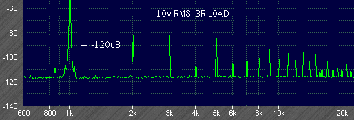 Reducing the load impedance can be expected to increase distortion, and the next tests are 1kHz at 4V and 10V rms with a 3R load. Many high harmonics are revealed, but note that the averaging function has been used, and without this few of the higher harmonics would be visible above the noise. At 10V (33W) only the 2nd, 3rd and 5th harmonics are above -120dB (0.0001%).