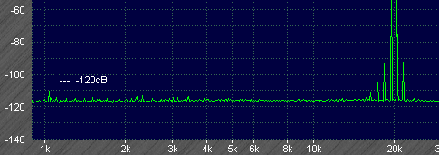 MJR7-Mk1 Distortion: Input 7.5kHz at 300mV. Although this looks a little spiky the only audio frequency component is the 15kHz second harmonic, measured at -106dB (0.0005%).