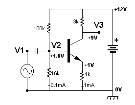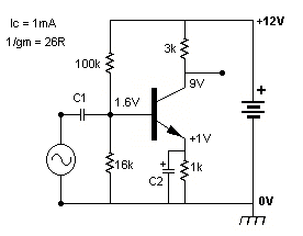 Next we need to choose the base bias resistors, shown as 16k and 100k. We know there is 1.6V across the lower resistor, so to find its value we need first to choose how much current is to flow through it. Again we don't want it too low or too high. With low current the error added by the transistor base current could upset our calculations The base current is the collector current divided by the current gain, which can vary over a big range for a chosen transistor type, but will be taken to be 250 for the present example. This gives base current in our example of 4uA (that's micro-amps, it should be the Greek letter mu rather than u, but that is easier to type.) Using a high current through the resistors would give a low value resistor and increase the current input required from the signal source, but our choice of 0.1mA current and 1.6V gives a reasonable resistor value 16k.