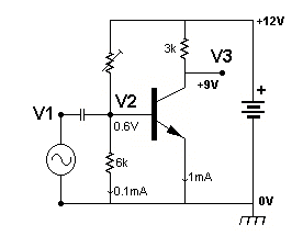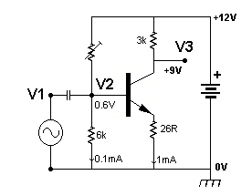 Finally we have the 3k collector load resistor, and this has been chosen to drop 3V with its 1mA current, giving a collector voltage 9V. The collector current is actually slightly less than 1mA because the 1mA emitter current is the sum of base current and collector current, so a more accurate figure for Ic is 996uA, but this is close enough to 1mA given that we will anyway be using resistors with 1% tolerance, and there will be other errors including thermal effects, so there is no point trying to be too exact. Unless a very low gain transistor is being used it is usually accurate enough to assume the same values for emitter and collector currents.