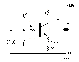 Now we can no longer assume Vbe is constant, it will include the AC input voltage added to the DC level of 600mV. A positive change in Vbe of 1mV will increase the collector current, but a 1mV negative change will not reduce the current by exactly the same amount, this is a result of the nonlinear relationship between collector current and Vbe. The percentage difference between the positive and negative effects will however be low for small input signals, so it is common to ignore the nonlinearity for 'small signal analysis'. 1mV is just about small enough to justify treating the circuit as linear for our present purpose. (The harmonic distortion for a 1mV peak sinewave input will be about 1% for this circuit, which may be too much for some applications. The percentage distortion is numerically equal to the signal level in mV to a good approximation, so for example 0.1mV peak input gives 0.1% distortion.)