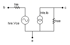 hie = 6k (wrong? Should be 4k3 at 2mA if hfe = 330)The next diagram gives some idea what these mean, hie is the input impedance, hfe is the current gain, hoe is the output conductance ( but only in a common-emitter circuit ), and for the BC560B is typically 10uS. The impedance is the inverse of the conductance, which is 100k, so we can add a 100k resistor from collector to the earthed emitter.