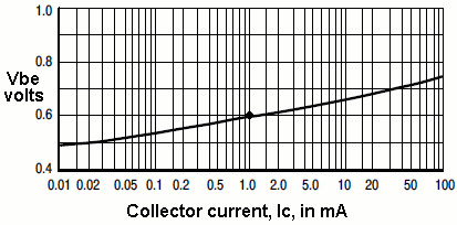 The value of Vbe for a given Ic is a function of junction temperature, falling about 2mV for every degree increase, and is also affected by collector voltage, so we need to avoid making our circuits too dependent on an exact value of Vbe.