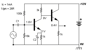One problem with this basic circuit is that the output impedance is fairly high, a little under 3k, which is ok if the following stage or load has a high input impedance, but a lower impedance load will reduce the voltage gain of the circuit. The gain is proportional to the total load, which is the 3k resistor in parallel with the connected load. One option is to add a second stage as shown next, the added stage is known as an 'emitter follower' on the grounds that the voltage at the emitter follows the base voltage apart from an almost constant difference (Vbe) around 600mV.