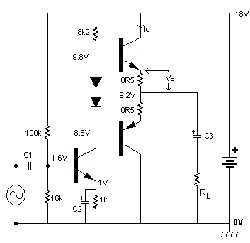 The output transistors could be operated at high enough current to ensure they can drive the chosen load without either of them switching off at any point, and this is classified as class-A operation. With a lower operating current one of the transistors may be reduced to zero current when the other transistor is providing high output current, then operation is in class-B or class-AB depending on whose definition of class-B you choose. In the diagram above a pair of diodes are included to provide the bias voltage to make the output transistors conduct, and these will at least compensate to some extent for temperature effects, each having a similar -2mV / deg.C temperature coefficient as the base-emitter voltages. In practice we want to use fairly small emitter resistors for the output transistors and then bias voltage is quite critical, and some sort of adjustable bias is needed using a preset potentiometer. The usual bias circuit used has a transistor and several resistors, including one preset, to provide both adjustment and temperature compensation.