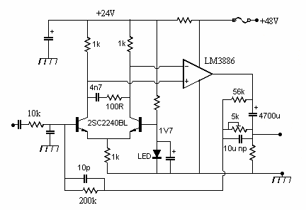 Next is a simple low cost alternative using a LM3886, which may now be difficult to find. There may be stability problems to solve, but the power output should be about the same 30W as the MJR7 but with only 48V supply.