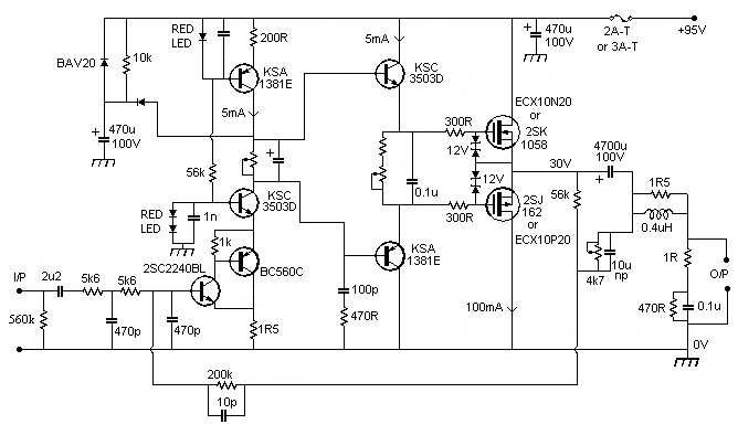 Next is a variation of the MJR7 which reduces the currents in the driver stage to 5mA and so is better for a higher supply voltage, not needing heatsinks for the driver stage transistors. A problem is that two bias adjusters may be needed to set both driver stage and output stage quiescent currents. Apart from the reduced driver currents the only other advantage is that the circuit maybe looks more conventional, but the performance will be no better than the original MJR7.
