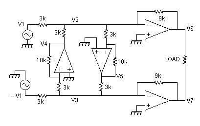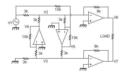 This is a 'zero distortion' bridge amplifier I first thought of in 1977, and set up on an analogue computer in the Physics Dept at UWIST (Wales). It seemed to work ok, but if one side clips first there is then a unity gain positive feedback loop which could be trouble. In effect each half of the bridge acts as a feedforward error amplifier for the other half, with the result that the distortion outputs are identical, so the difference V6 - V7 has no distortion.