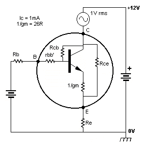 It would be nicer if the circuit had at least a slight agreement with the known physics of transistor operation, but for now I only want to get a model that gives about the right answers, with no danger of negative resistances or other improbable results turning up. The transistor symbol should be understood as an idealised transistor with constant Vbe and infinite output impedance, the small signal variations in Vbe being contributed by re = 1/gm, and the output impedance is determined by Rce and Rcb. The current gain is still hfe.