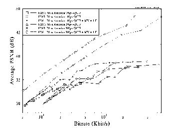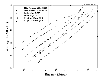 The graph below show the image quality versus bitrate for several QCIF video sequences, at 10 and 30 frames/s. Click on the graph for the full size version.