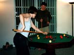 Jenny & Chuck, the newest newly-weds, play a game of bumper pool.