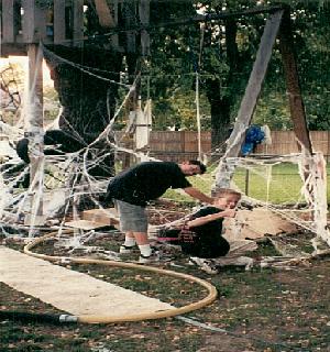 Get your eyes off the camera and get back to work After night 1, we needed to change some things and add a few more things. These guys, A.j. and Chris, are fixing my control area and putting up some spider webbing. The tube that is running along the yard is for the fog. We added fog to the hallway on the driveway for night 2. It was another cool effect that should have been used during night 1. |