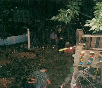 This was another one of my interesting scenes. You entered this room after you came through a room that had string hanging from the ceiling. (Take kite string and hang it from the ceiling, then spray it with water and you get an instant spider web.) The only lights in this room were two red siren lights and they were angled differently so that you got a different effect. When you first entered the room, you were hit with cold air from two fans that were attached to the ceiling. The fans were angled so that they would hit your necks when you walked by. You then proceeded around the pool table where a ghoul would jump out at you. From there, you headed towards the exit of the room and you were shot with a blast of air from under the pool table. This room got plenty of people screaming.
