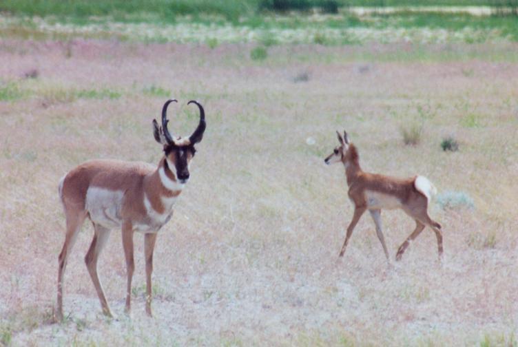 Pronghorns -- buck and fawn, Honey Lake, California, July 1999.