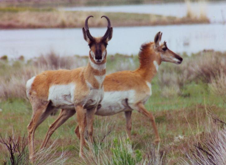 Pronghorns -- buck and doe, Honey Lake, California, July 1999.