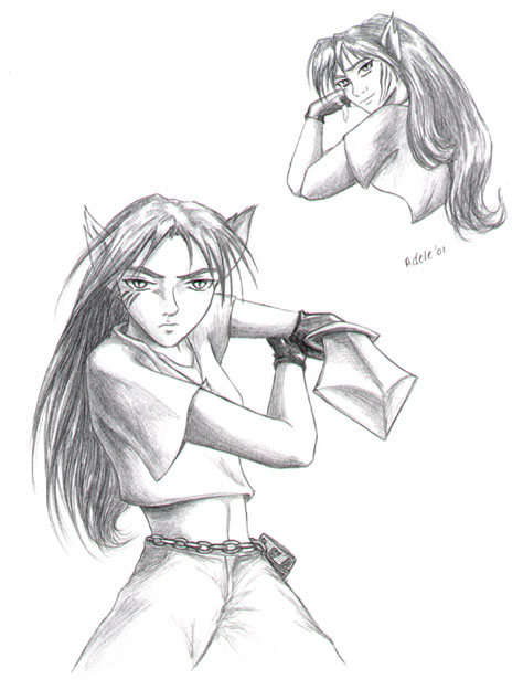 Maven is 5'11 with long flame red hair that flows down her back and wild sea green wolf eyes, under her right eye is three small scars. On her left cheek she has claw scars from her pointed wolf like ear to her chin She wears a White shirt a pair of jeans that are ripped at the knee. Her small waist is bare. She wears a pair of black fingerless gloves. She has a sheathed sword that hangs from a chain at her bare waist, a golden necklace with a medallion with the coat of arms for Rogue's Scottish Clan graces her neck. Her movements are raw and animalistic.