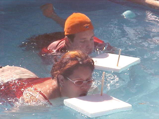 | Con la novedad de los concursos acuáticos, se implementó éste, que consistía en ir nadando y soplar hasta hacer llegar un barquito de hielo seco hasta el otro lado de la piscina. |