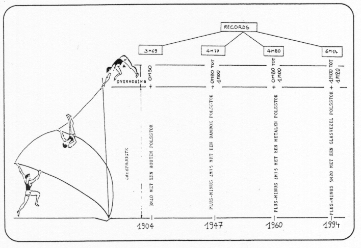 is de maximum gekende hoogte ooit overschreden slechts 3 m 69.Rond de eeuwwisseling werden plots de lichtere bamboestokken gebruikt. Oorspronkelijk was Japan de bakermat, maar weldra was de bamboestok over gans de wereld gekend en was het de universiteit van Yale in Amerika die het gebruik ervan verspreidde.